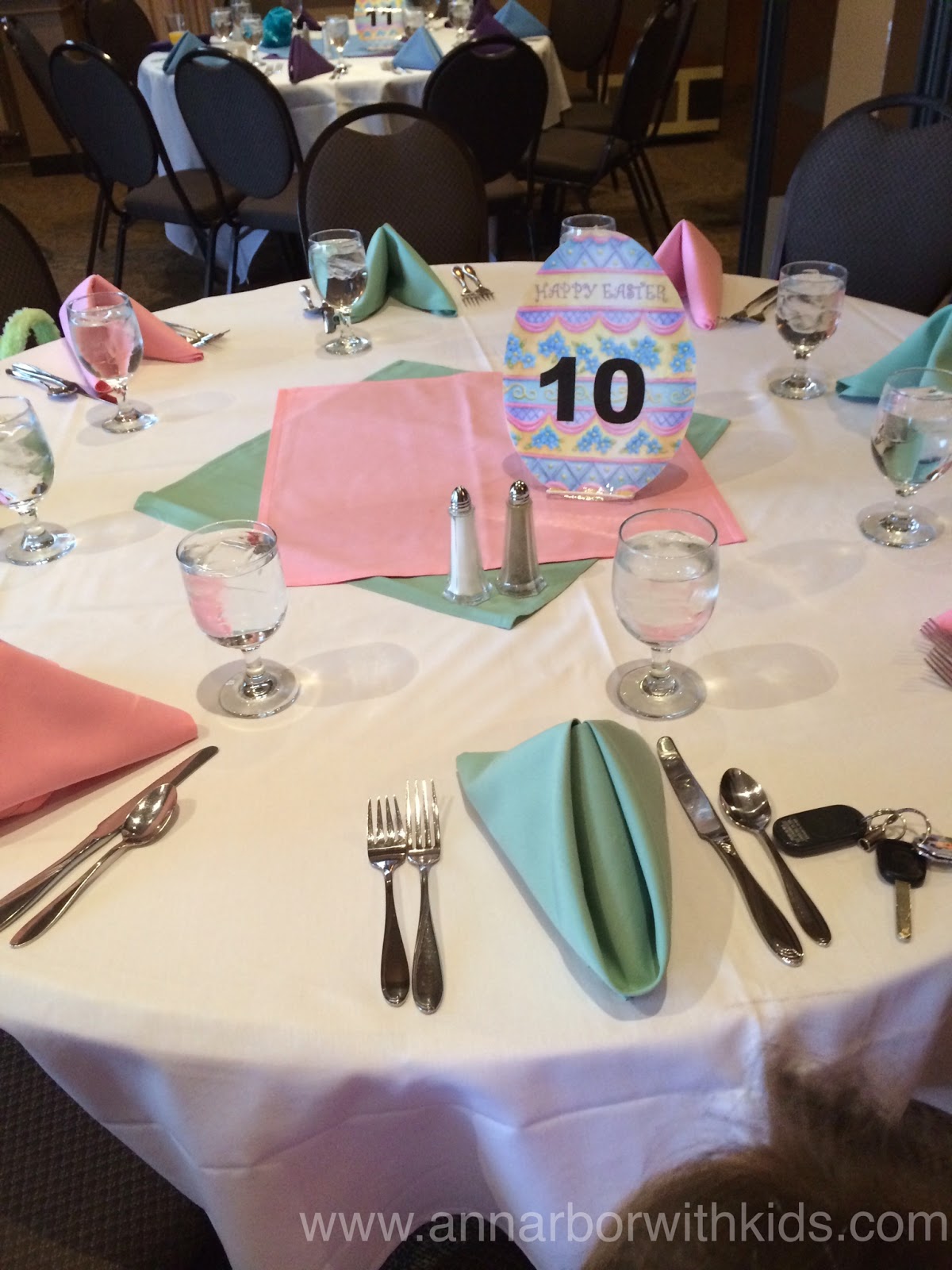 After finding her eggs, we headed to the African Lodge for breakfast. At breakfast we had assigned seats…coincidentally with the family that we waited in line and hunted eggs with. Another family with young children was also assigned to our table and joined us shortly after. I asked them how the younger children’s egg hunt was and they said that the eggs were getting picked over in the front of the playground, but that they were replenished so there were plenty of eggs for everyone.