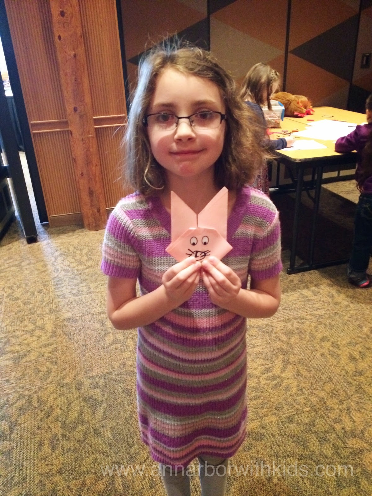 At breakfast, they also had crafts, live animals, and of course the Easter Bunny came to visit. My daughter loved the giant “Lite-Brite” with changing color lights, seeing the animals and the crafts. Her favorite craft was the Bunny Origami.