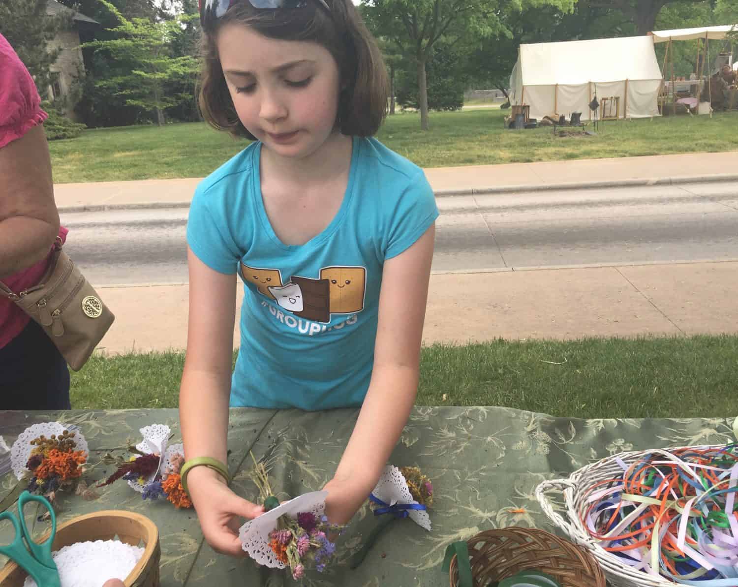 Along the Porches & Parlors section, my daughter made a Tussie-Mussie – a floral posey. The flowers in the posey each have different meanings.